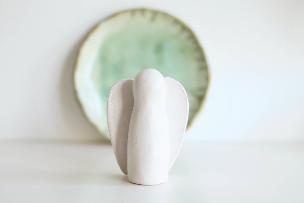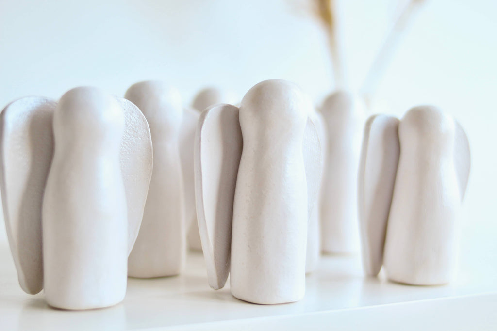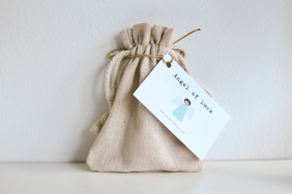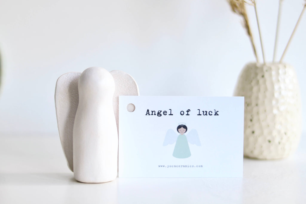 Angel of luck A linen bag with a handmade ceramic angel and accompanying card. A ceramic angel in the color white wrapped in a gift box to give as a gift! This sweet little ceramic angel is not only beautiful to see they are also individually handmade, processed and baked in a studio making each item unique in shape. Give this beautiful angel as a gift to someone who can use an extra portion of luck! The angel can be placed anywhere so the recipient can always be reminded of your kindness. The angel is hand formed and made of clay, in short a nice and durable gift to give! What will you receive in 1x ceramic angel of luck (7.5×5.5 cm) linen bag An accompanying sustainable printed card Raw material: pottery (ceramic)