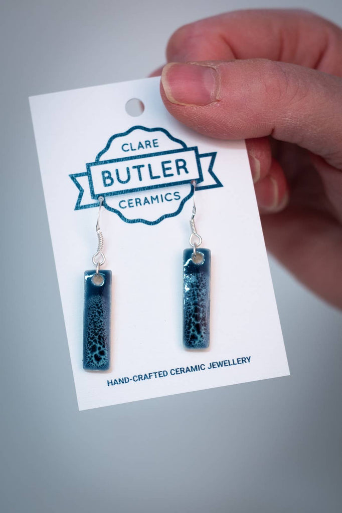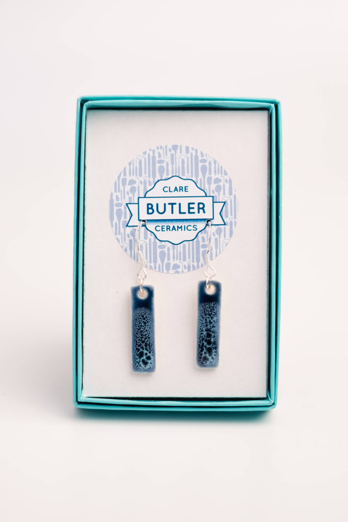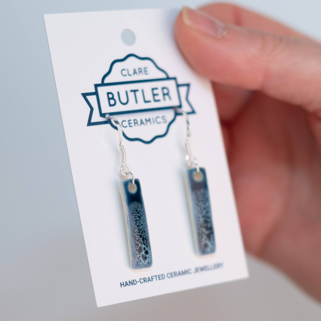 These porcelain earrings are lovingly made with care. Each piece is hand cut from slabs of porcelain clay, smoothed and fettled, before bisque firing to 1060°. Then it is hand painted with glaze, and fired again to 1280°. When the work emerges from the glaze kiln it is ready to be fitted with sterling silver findings, to complete the piece.