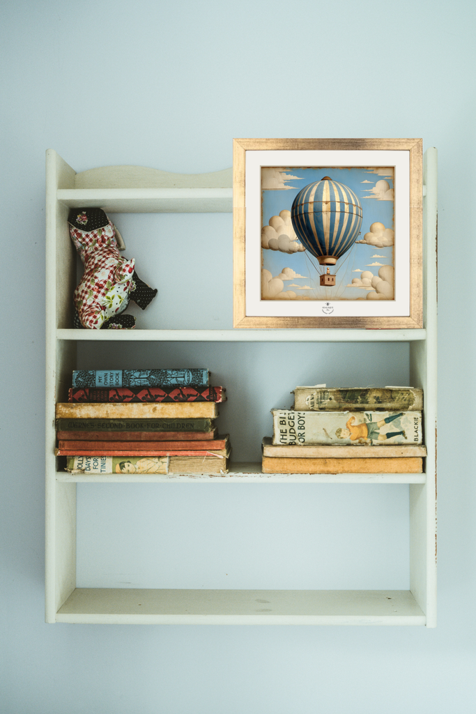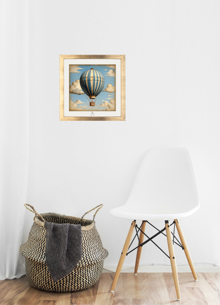 Illustration on Fabriano Cotton Rag paper 240 gr. Printed in France. Illustration dimensions: 18x18 cm Aged gilded wooden frame and glass: 20x20 cm - 13 mm molding The Scholar and the Hot Air Balloon Once upon a time, there was a scholar named Achille, who was passionate about the stars. Every night, he observed them from solid ground, dreaming of getting closer to them. One day, he had a brilliant idea: to build a golden hot air balloon to rise up to the heavens. With the help of the villagers, he spent weeks crafting his masterpiece. The big day arrived, and Achille settled into the basket. As the hot air balloon gently ascended, the villagers, amazed, shouted to him: — Tell us what you see from up there! But, obsessed with his desire to touch the stars, Achille ignored their calls. The higher he went, the more isolated he felt. The stars remained out of reach, and the silence of the skies became overwhelming. Eventually, he descended, disappointed. The villagers, still enthusiastic, welcomed him: —
