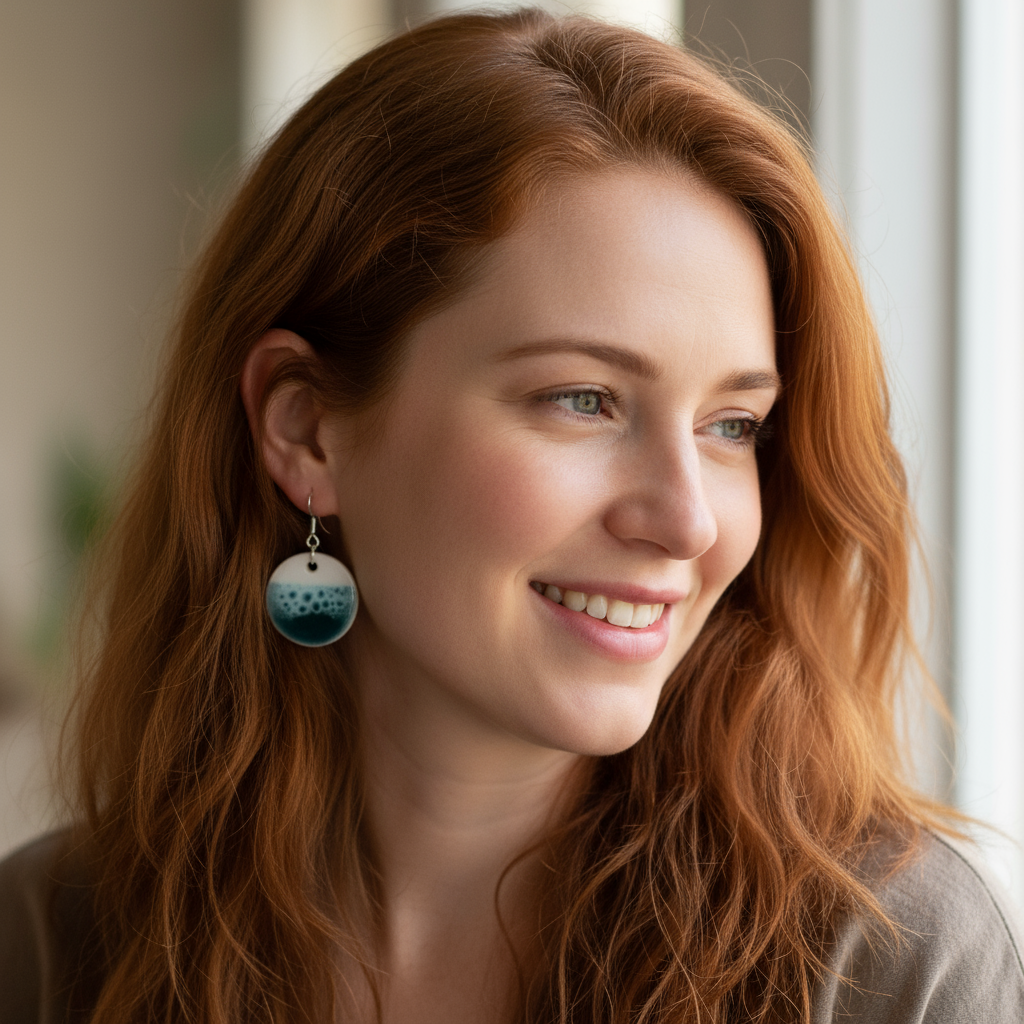 The earthy greens, blues and turquoises of the Wild Atlantic Way are at the heart of my work. I aim for a calming organic aesthetic that resonates with sea lovers and those drawn to natural materials. These porcelain earrings are lovingly made with care. Each piece is hand cut from slabs of porcelain, smoothed and fettled, before bisque firing to 1060°. Then it is hand painted with glaze, and fired again to 1280°. When the work emerges from the glaze kiln it is ready to be fitted with recycled sterling silver findings, to complete the piece. *As all pieces are handmade and glazed they are unique and may not be an exact match to the images above. All product packaging is plastic free, and either made from recyclable, compostable or recycled materials.