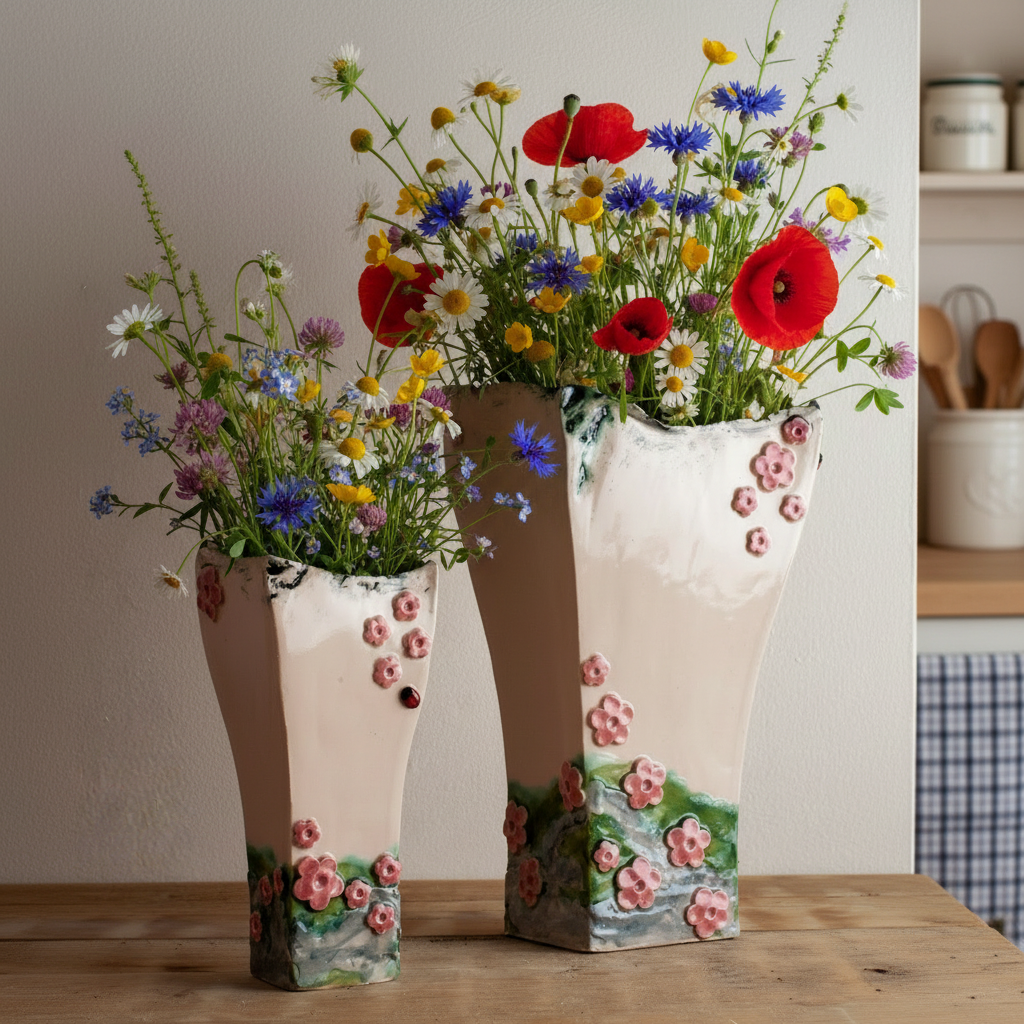 This image is an example of The Bloody Cranes-Bill Burren Vase. Please remember each piece is hand made and no two Vases will be the same. The arrangement of the flowers on the vase will vary and the colours may vary slightly