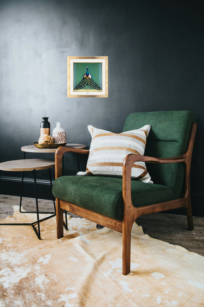 Illustration on Fabriano Cotton Rag paper 240 gr. Printed in France. Illustration dimensions: 18x18 cm Aged gilded wooden frame and glass: 20x20 cm - 13 mm molding The Peacock In a setting worthy of the most sumptuous salons of the 19th century, Odalisque captures the majesty of the peacock, a bird of display and emblem of sovereign elegance. Its proud bearing, opulent feathers, and sculptural silhouette recall the splendor of imperial courts where extravagance unfolded as an art of living. In the manner of cabinets of curiosities where exoticism met refinement, this image evokes the palaces of Joséphine de Beauharnais and Caroline Murat, where aviaries were filled with rare birds, symbols of power and aesthetics. Inspired by the Orient and the splendor of distant expeditions, the peacock then reigned among velvets and gilding, an incarnation of absolute beauty. With its deep shades of blue and gold, this illustration celebrates the encounter between nature and decorative art, a precious dialogue that spa
