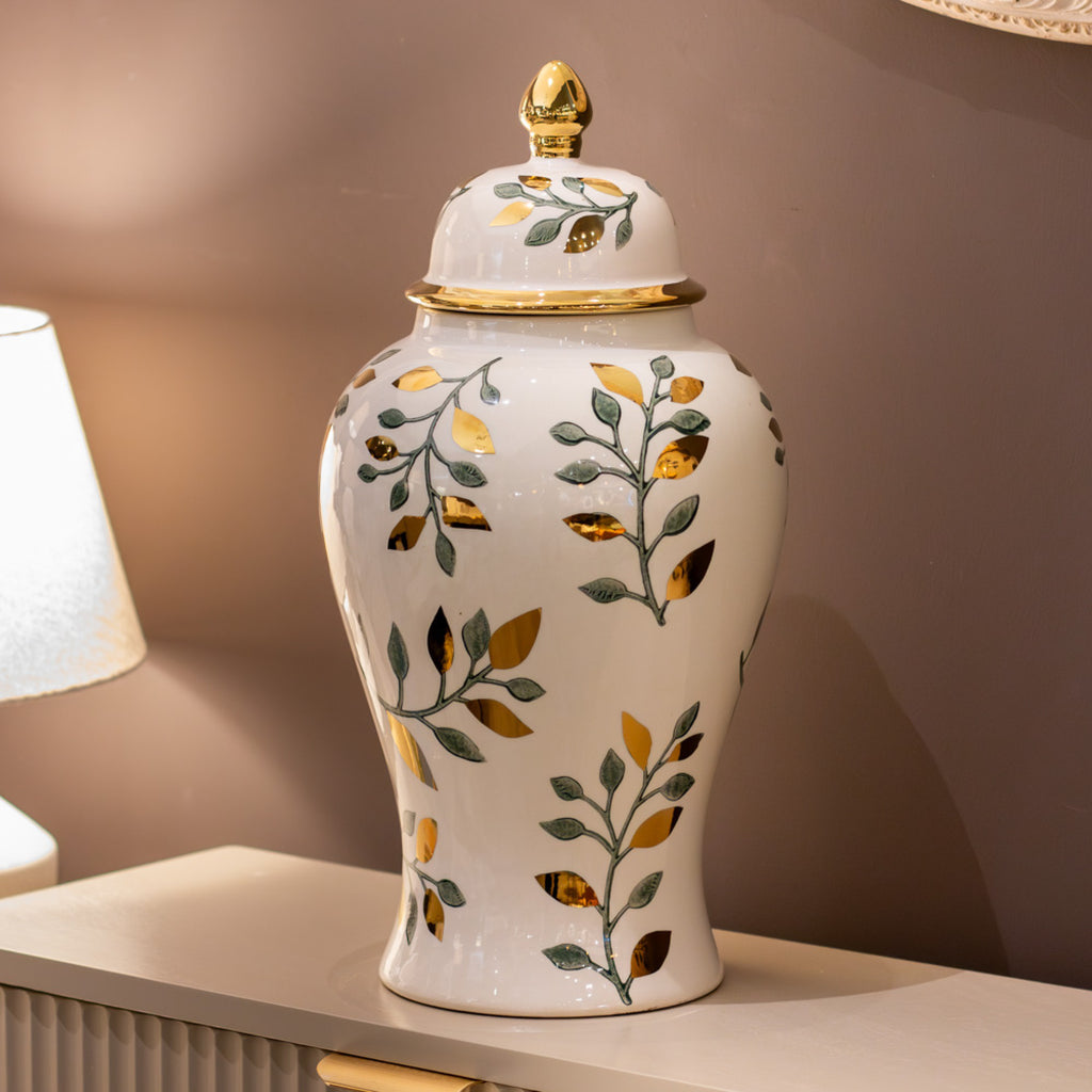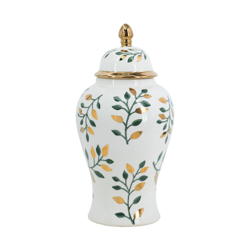 Add a touch of classical elegance to your home with our Green and Gold Ginger Jars. These stylish interiors will elevate any space with their timeless colorway. Perfect for any decor, these jars will add a touch of sophistication and charm.