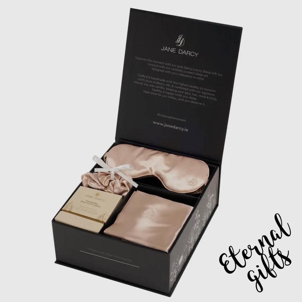 Treasure the moment with the Jane Darcy Luxury Sleep Gift Set (Pillowcase, Eyemask, Scrunchy & Candle ) in their stunning Champagne tone. Unwind with their carefully curated sleep set, designed with your relaxation in mind. Crafted & handmade with the highest quality 22 momme 100% pure mulberry silk, & combined with their signature natural soy wax candle Tranquility.