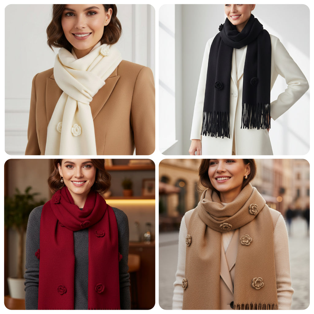 This versatile wool scarf comes in four beautiful colors - Winter White, Tan, Black, and Grey. It adds chic and elegance to any outfit while keeping you warm. The embroidered flowers add a touch of charm. Perfect for any season.