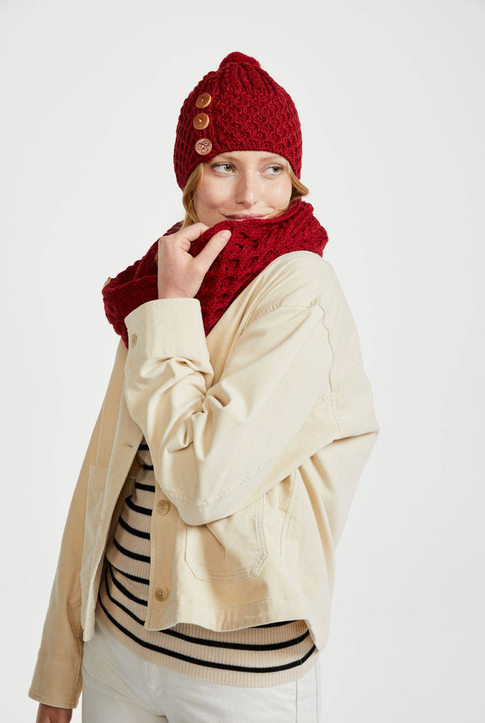 Stay warm with Aran wool this winter. Perfect for outdoor adventures, the Shrule Aran Hat is made with luxurious 100% Merino wool, giving you the extra warmth you need to escape the winter breeze. This beanie style hat showcases a beautiful trio of decorative, smooth, wooden buttons, bringing depth and texture to this winter wonder. Perfectly paired with an Aran pom pom, because it’s much more fun that way.