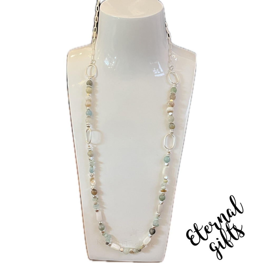Flaunt effortless elegance with the Bernadette Long Beaded Neckpiece in Opal Greens by Estela! This exquisite silver chain is adorned with opal green beads, adding a touch of luxurious sophistication to any outfit. An effortless way to elevate your style!
