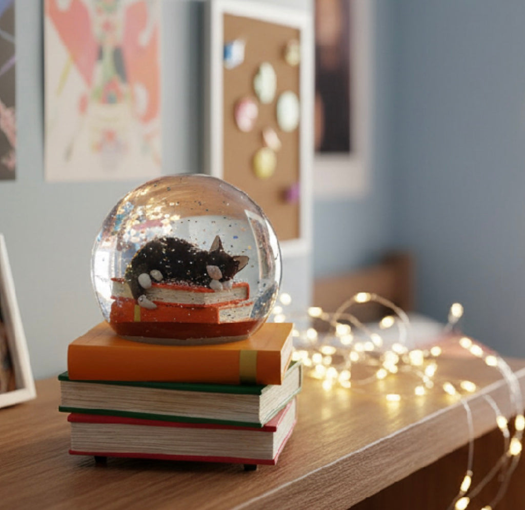 100 mm glitter ball cat music box on a pile of books. The scene in the sphere rotates to a familiar melody.